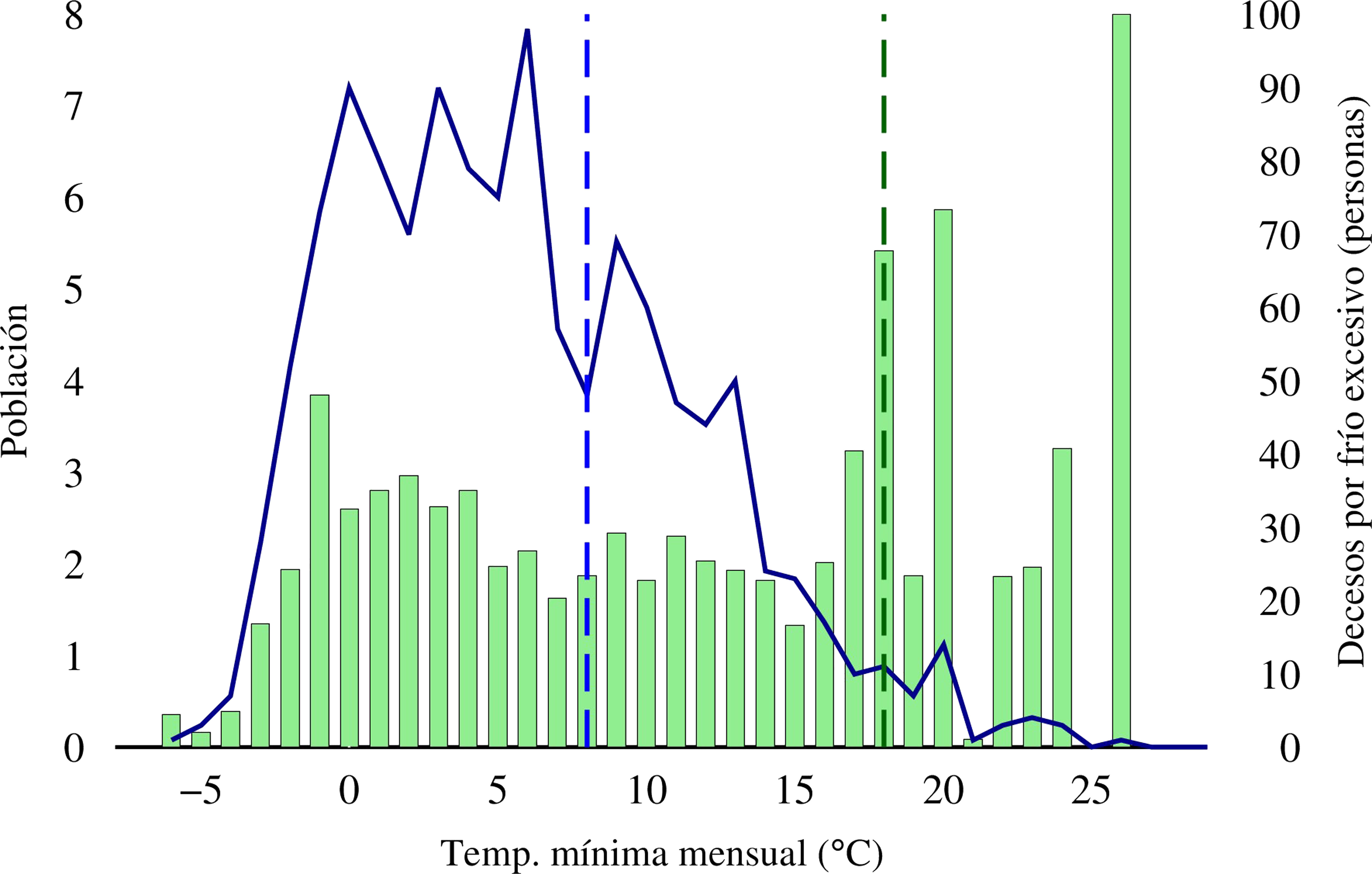 Nota: la línea discontinua azul (a 8°C) marca el percentíl 67 de los datos de mortalidad y la línea verde discontinua (a 18°C) marca el percentíl 67 de los datos de población.