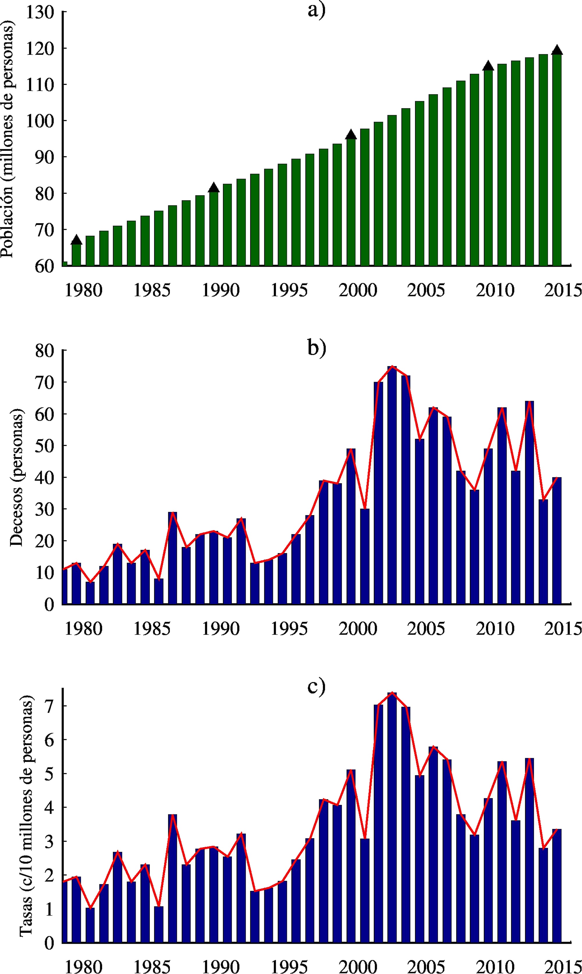 Los datos de CRU TS4.01 fueron comparados con los de mortalidad en términos de los números totales de personas fallecidas y de tasas de mortalidad. Para calcular éstas (por cada 100,000 habitantes), se ocuparon los datos de número de habitantes por municipio de los censos de 1970, 1980, 1990, 2000, 2010 y del conteo 2015 (INEGI, 2010). Después, para comparar directamente los datos de tasas de mortalidad con los de clima, la información de los censos de cada municipio fue interpolada a una resolución mensual, debido a que los datos de mortalidad y de clima son mensuales, pero los de número de habitantes son decadales (de los censos de 1980 a 2010) y quinquenales (los del censo de 2015).