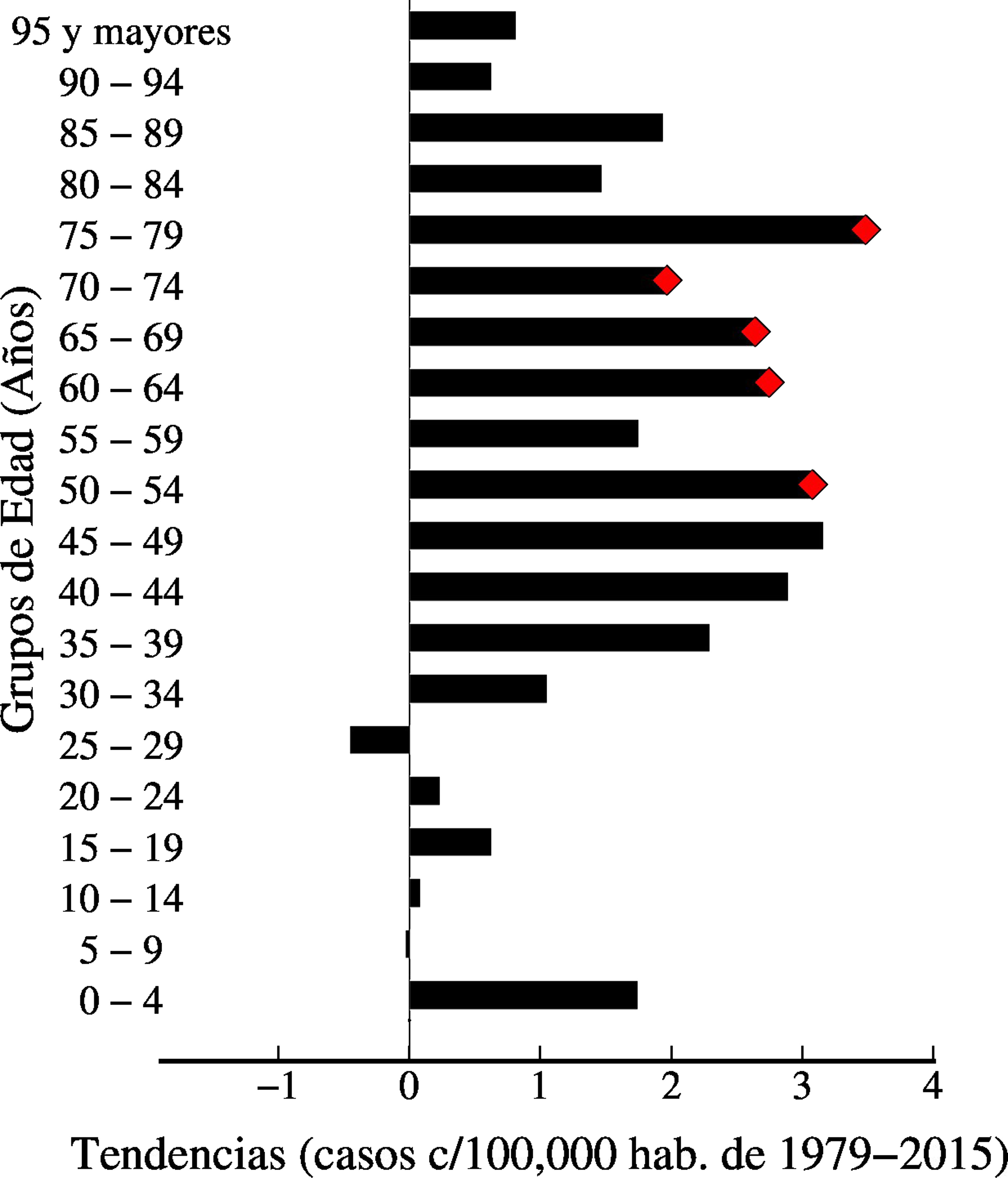 Por otro lado, la mayor mortalidad entre mujeres adultas ocurre alrededor de los 85 años. Del cuadro 3b, también es notable que los niños y las niñas menores de 5 años registran valores altos de mortalidad. Las tendencias lineales para cada grupo poblacional mostrado en el cuadro 4 son estadísticamente significativas en el grupo de hombres (cuadro 5), lo cual revela que en las últimas tres décadas hay una tendencia al alza de mortalidad por frío entre hombres de entre 50 y 80 años de edad. Estos resultados son consistentes con estudios previos nacionales (Jáuregui et al., 2020) y de otros países (Nixdorf-Miller, Hunsaker y Hunsaker, 2006; Taylor, et al. 2001) que han mostrado una disminución en la mortalidad en todos los grupos de edad.