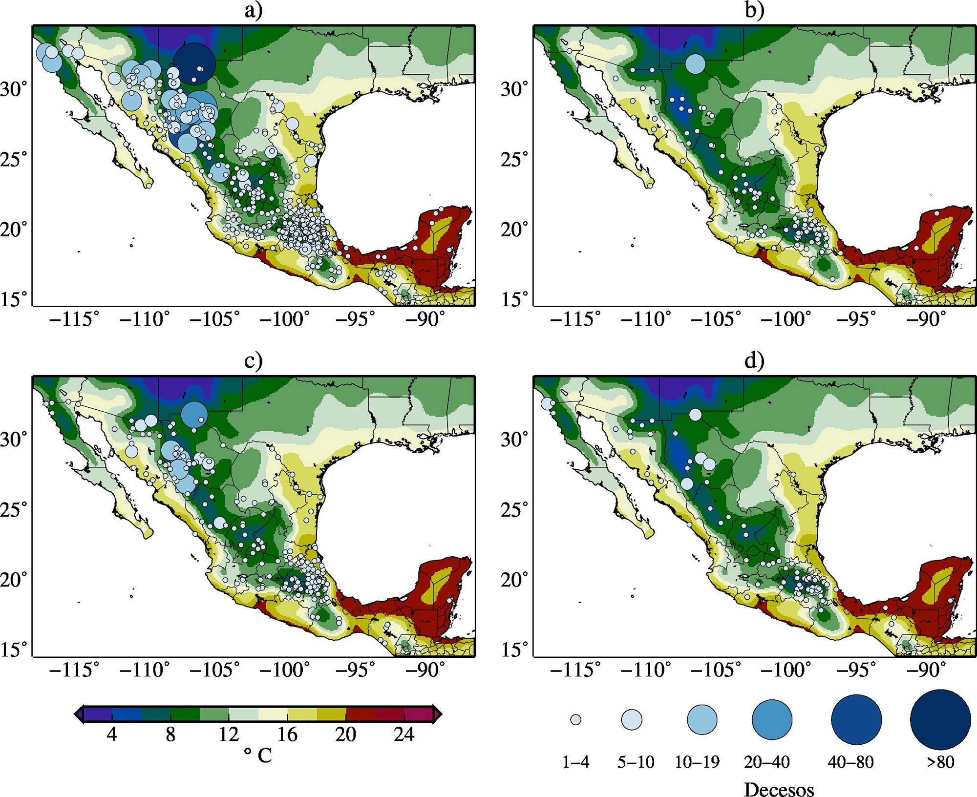 elaboración propia.En este trabajo, la distribución espacio-temporal de la mortalidad por frío excesivo es investigada dentro de un contexto climático caracterizado por temperaturas mínimas mensuales. En términos generales, esta investigación contribuye a caracterizar el problema general relativo a los impactos del frío excesivo en México bajo la perspectiva de la gestión del riesgo, analizando conjuntamente amenazas y vulnerabilidades. De manera particular, los resultados detallan cuantitativamente los patrones espaciales, temporales y demográficos asociados a la mortalidad por frío intenso.