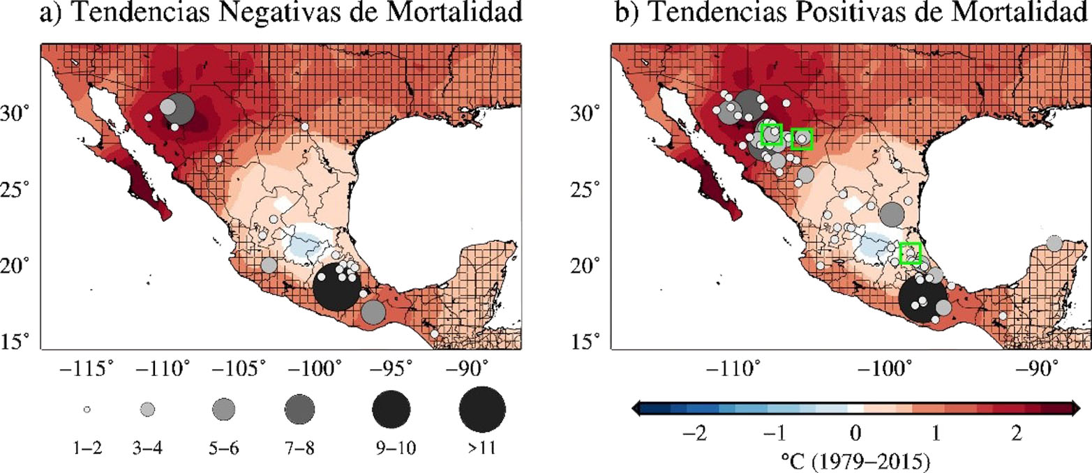 Sobre el análisis de tendencias, las de tasas de mortalidad negativas (disminución de casos; cuadro 7a) y positivas (incremento de casos; cuadro 7b) presentan patrones similares, pero sólo hay significancia estadística en las de incremento de tasas de mortalidad al oeste de Chihuahua, así como entre Veracruz y San Luis Potosí. Por otro lado, respecto a la temperatura (cuadro 7 a y b), la mayor parte del país ha registrado tendencias estadísticamente significativas de calentamiento (tendencias positivas), las cuales son principalmente notorias sobre las regiones norte y noroeste de México y centro-sur, así como la Península de Yucatán.
