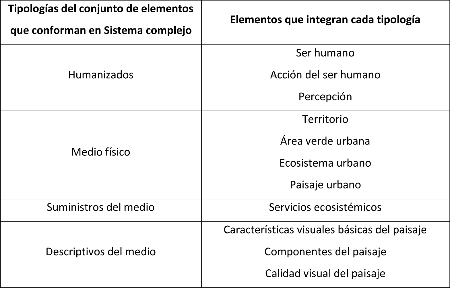La identificación de los elementos del sistema complejo integrado por áreas verdes urbanas, analizadas desde un enfoque ecosistémico y un enfoque paisajista; conllevó a una extensa revisión teórica y epistemológica de cada elemento. Como resultado, fue posible el análisis y descripción del sistema, las relaciones existentes y el sentido de la relación; así como de sus elementos integrados a las categorías de análisis a) percepción, b) servicios ecosistémicos y c) calidad visual del paisaje; partiendo de la visión sistémica de García (2006). Las áreas verdes urbanas constituyen un sistema complejo en el que interactúan diversos elementos sociales, ambientales, culturales y políticos, por lo que su interacción no es mecánica ni lineal.
