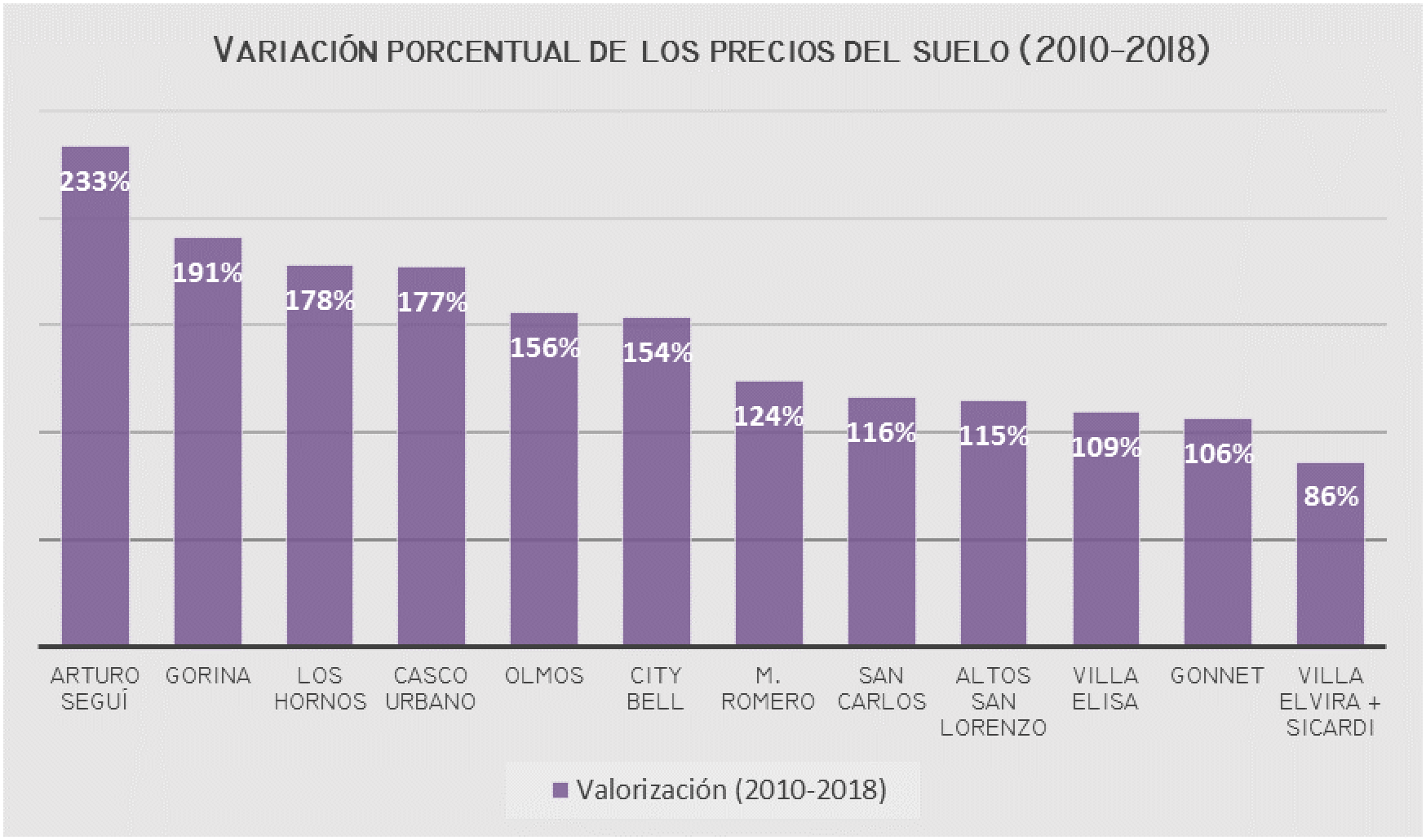 En promedio los precios subieron en todas las localidades a más del 100%. La menor variación porcentual se registra en el eje sureste (101%) y las mayores variaciones se dan en las localidades posicionadas en las cercanías de las vías de circulación principales como la autopista Ricardo Balbín, camino Centenario y camino General Belgrano hacia el noroeste, y la Ruta 2 hacia el sudoeste.
