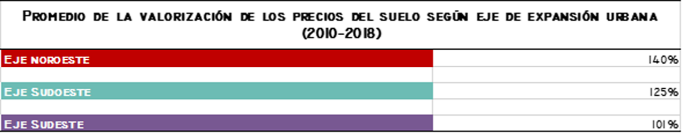 Por lo cual, estos cambios introducidos en las nuevas normativas suelen propiciar procesos especulativos reflejados en la pugna entre diversos actores sociales dentro del mercado de suelo para adquirir tierras que incluyan mayores y mejores usos. Esto se agrava si se tiene en cuenta que las políticas de subsidio a la demanda tienden a generar un incremento significativo en los precios del suelo si no se garantiza su disponibilidad por ser un recurso escaso. No obstante, la variación en los precios del eje sureste no alcanzó los precios más altos de la periferia. Sobre el eje noroeste pueden identificarse los precios más elevados de las últimas dos décadas (cuadro 4).
