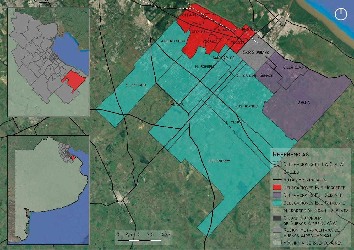 La ciudad de La Plata, localizada en el Partido homónimo, se encuentra a 56 km de la Ciudad Autónoma de Buenos Aires y es la capital de la Provincia de Buenos Aires. Su principal característica es que fue diseñada bajo normas higienistas y planificada desde su fundación con base en un esquema de planificación del territorio en el que se demarcaba el casco urbano a diferencia de las zonas destinadas a actividades agropecuarias intensivas y/o extensivas desde una circunvalación. Con el paso de los años, la ciudad creció más allá de estos límites y conformó las periferias urbanas. Estas periferias se desarrollan en ejes viales que las estructuran; se pueden clasificar en: periferias del eje norte —a partir de los caminos General Belgrano y Centenario y las vías del Ferrocarril Roca que vinculan la ciudad con la capital del país—, del eje sureste —de las Avenidas 122, 7 y 137— y del eje suroeste[3] con el vínculo hacia el interior del país a en las avenidas 520, 44 y 60 (cuadro 1).