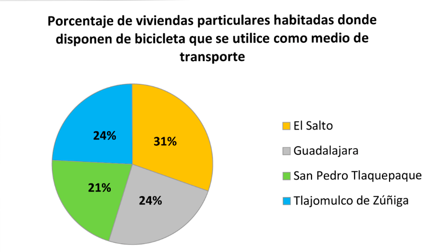 A pesar de contar con infraestructura deficiente, la bicicleta se ha convertido en una alternativa económica y de fácil acceso para la población de la zona. De acuerdo con los datos del Censo de Población y Vivienda, 2020, del INEGI, en los municipios de San Pedro Tlaquepaque, Tlajomulco de Zúñiga, Guadalajara y el Salto (que forman parte de la zona de estudio) entre el 20% y el 30% de las viviendas censadas disponen de bicicletas usadas como medio de transporte (ver gráfico 1).