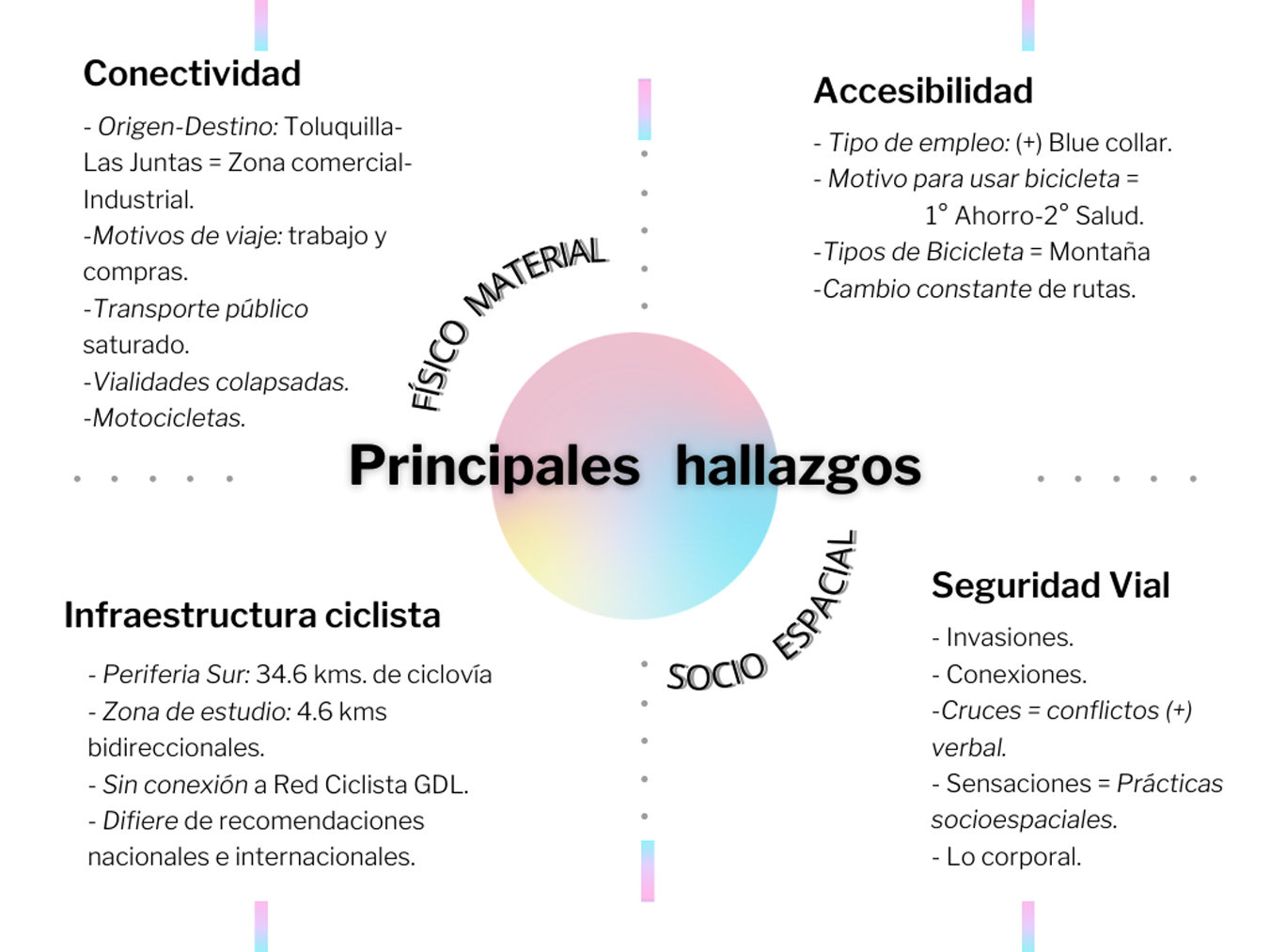 Los resultados apuntan al tipo de infraestructura existente en la periferia sur del AMG y a la ausencia de conexiones ciclistas seguras sin impacto completamente positivo en la zona, tal y como lo sugiere Pettinga et al. (2009); es decir, las particularidades de estos espacios físicos-materiales no mejoran el uso físico del espacio público, no proveen seguridad vial a las personas usuarias y, sobre todo, no logran incentivar una mayor equidad social, pues la bicicleta no se presenta como una opción segura para traslados de más de 5 km del hogar.