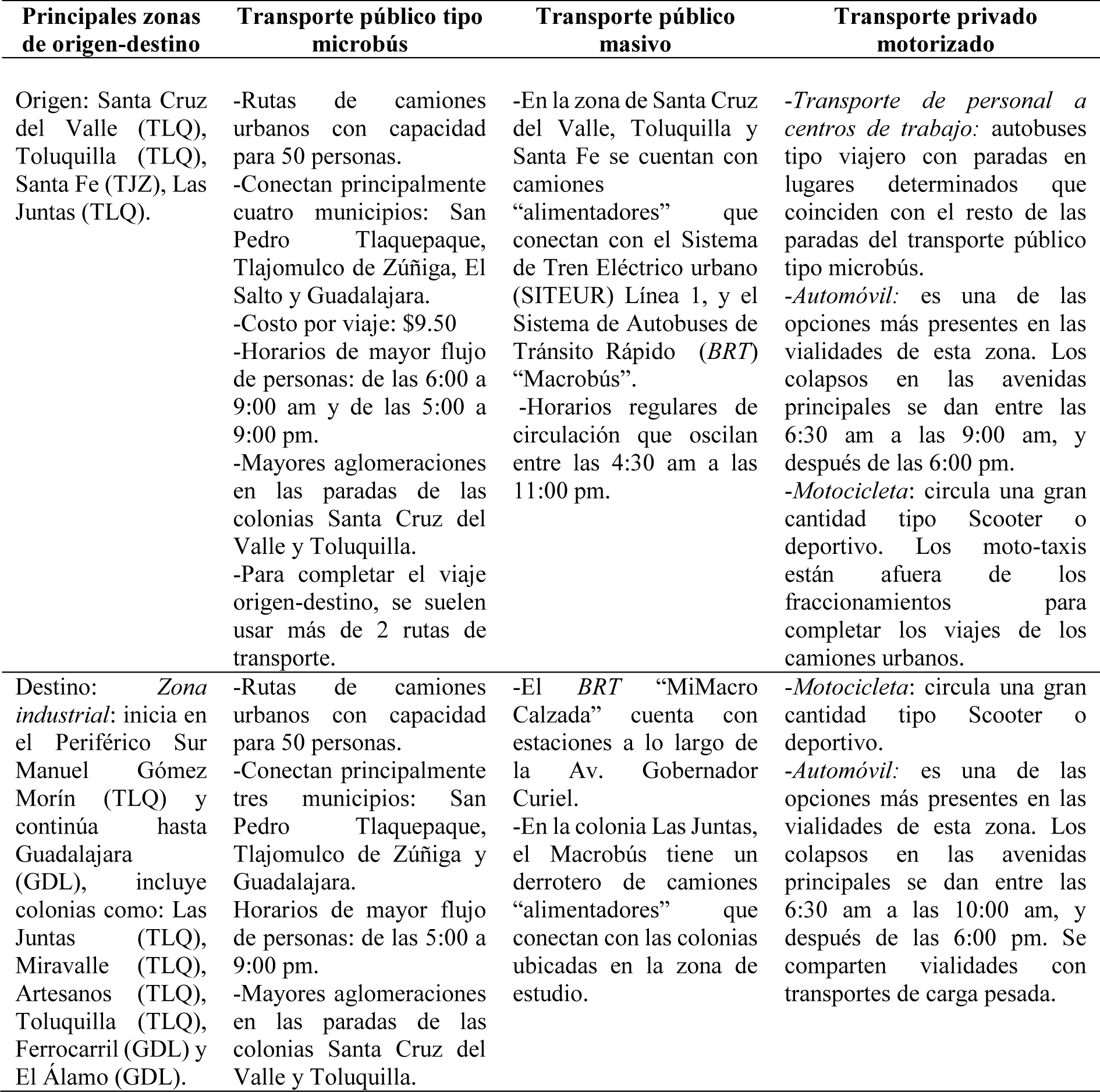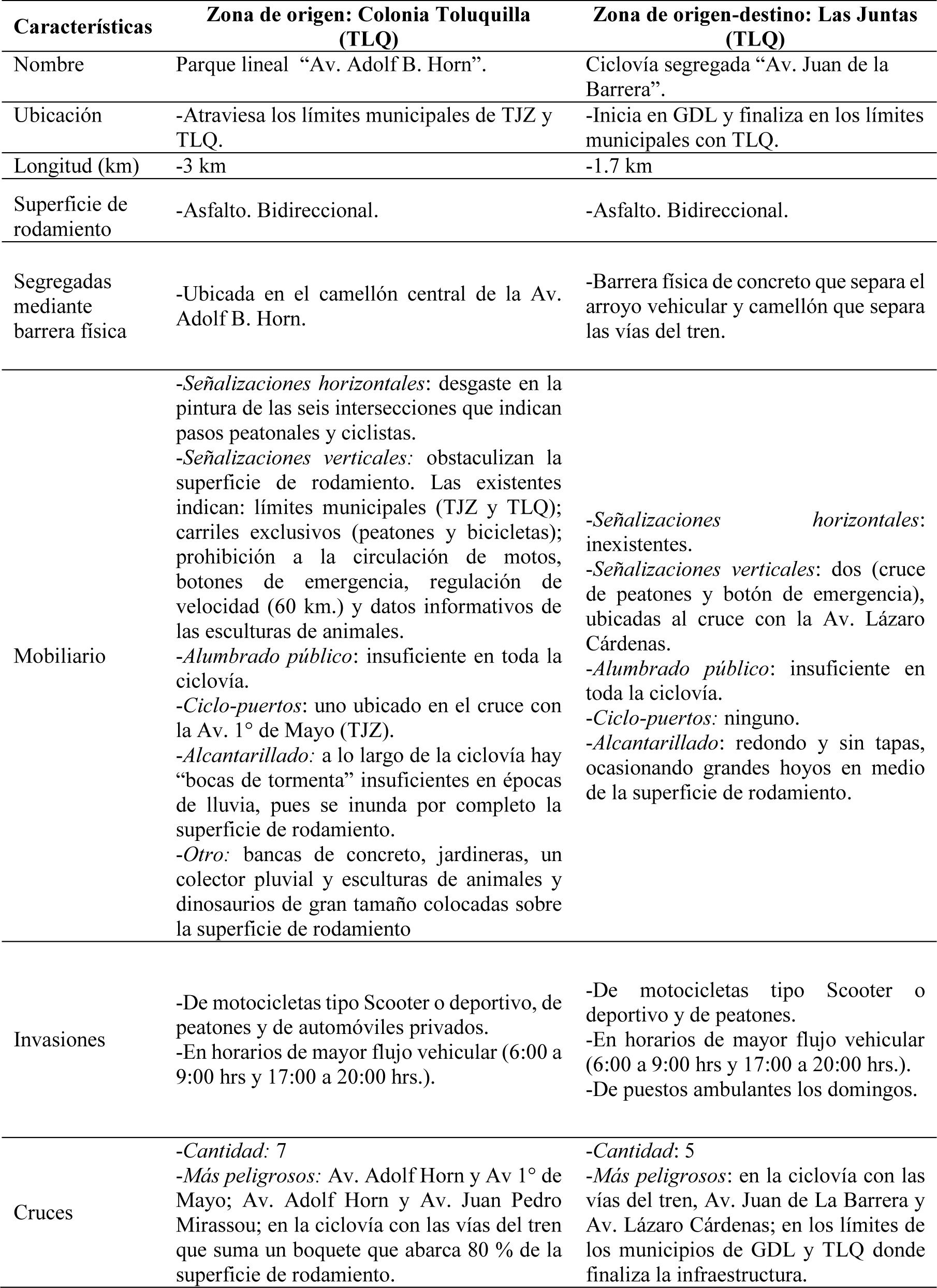 Conectividad: a través del levantamiento fotográfico, la observación participante y el muestreo por conveniencia se constata que las colonias Toluquilla (TLQ) y Las Juntas (ubicada en los límites de TLQ y GDL) son zonas de origen y, a la vez, de destino en los viajes ciclistas de la zona. Estas colonias y sus alrededores, desde la década de 1950, se consolidan como la zona industrial del Álamo (García y Núñez, 2017), en donde la población puede encontrar diversas fuentes de empleo. A continuación, la tabla 3 concentra, de manera general, las características económicas de las áreas de origen y destino en las principales rutas ciclistas.