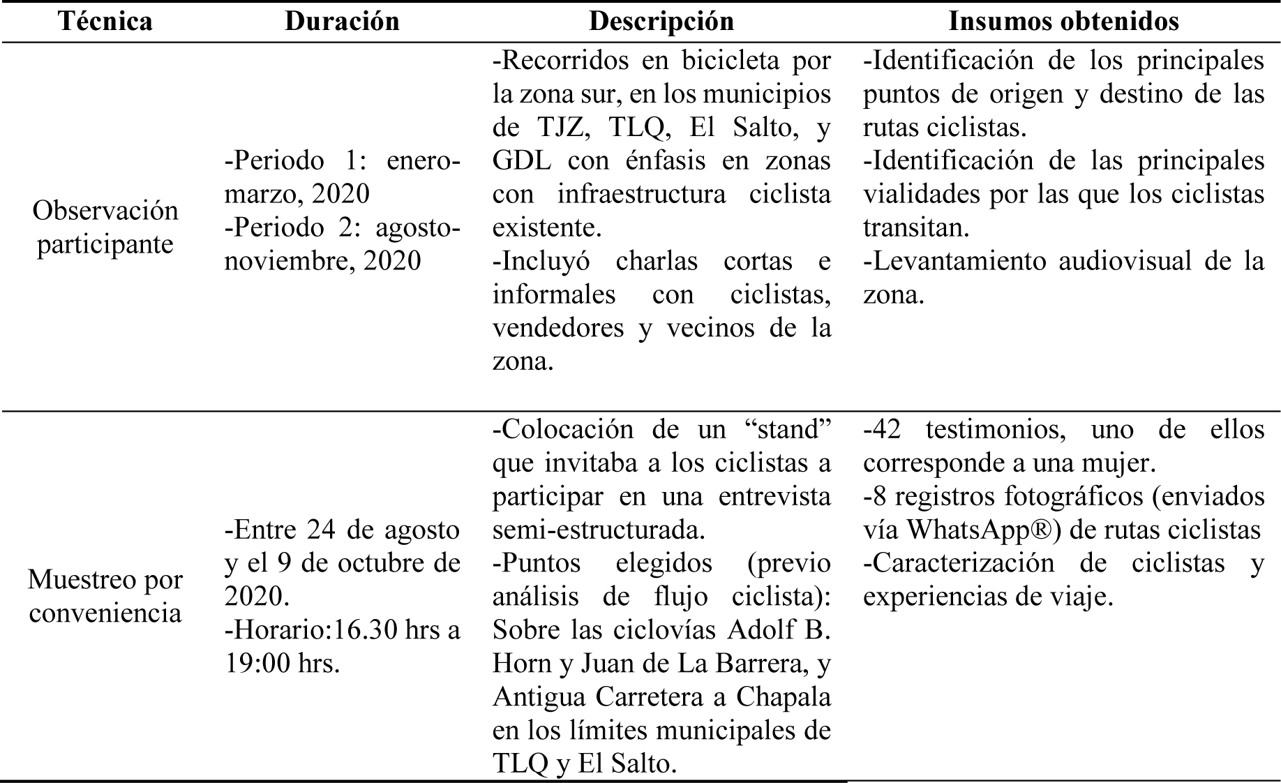 El periodo de recolección de datos en campo se realizó de enero a noviembre de 2020 en la periferia sur del AMG específicamente en localidades ubicadas en los municipios de Tlajomulco de Zúñiga (TJZ), San Pedro Tlaquepaque (TLQ) y Guadalajara (GDL). En vista de que el periodo de recolección estuvo atravesado por la contingencia sanitaria de la COVID-19, fue necesario elegir un método de participación y técnicas de recolección que permitieran respetar los protocolos de higiene y de sana distancia para evitar contagios. Se utilizaron dos técnicas: la observación participante y un muestreo por conveniencia (ver tabla 1).
