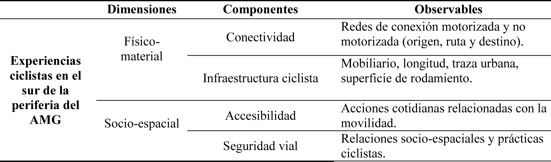 Debido a que la información cualitativa parte de los testimonios de los usuarios que circulan a diario por la zona de estudio, se triangularon los datos del muestreo con el levantamiento fotográfico de la observación participante, con el diario de campo de la investigadora y con los informes en materia de movilidad del área. La triangulación se guio conforme a dos dimensiones principales: la físico-material y la socio-espacial que permitieron entender cómo los sujetos interactúan con y en el espacio, además de exponer los resultados de acuerdo con las características de la infraestructura ciclista, la accesibilidad y la seguridad vial de la zona de estudio (ver tabla 2).