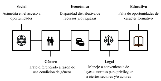 Por su parte, la desigualdad económica apunta a la distribución asimétrica de la riqueza o a la concentración del ingreso en grupos minoritarios. La desigualdad legal se hace visible en la aplicación de leyes de manera diferenciada; se beneficia a unos en perjuicio de otros sin mayor justificación. Finalmente, la desigualdad educativa es relativa a la falta de oportunidades para acceder a una formación académica o profesional.