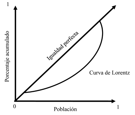 Los datos de la tabla 1 fueron interpretados con la curva de Lorenz, esto es, si la curva (coeficiente de Gini) se acerca a la línea de 45°, la distribución es cada vez más equitativa, de lo contrario, el nivel de desigualdad es mayor.