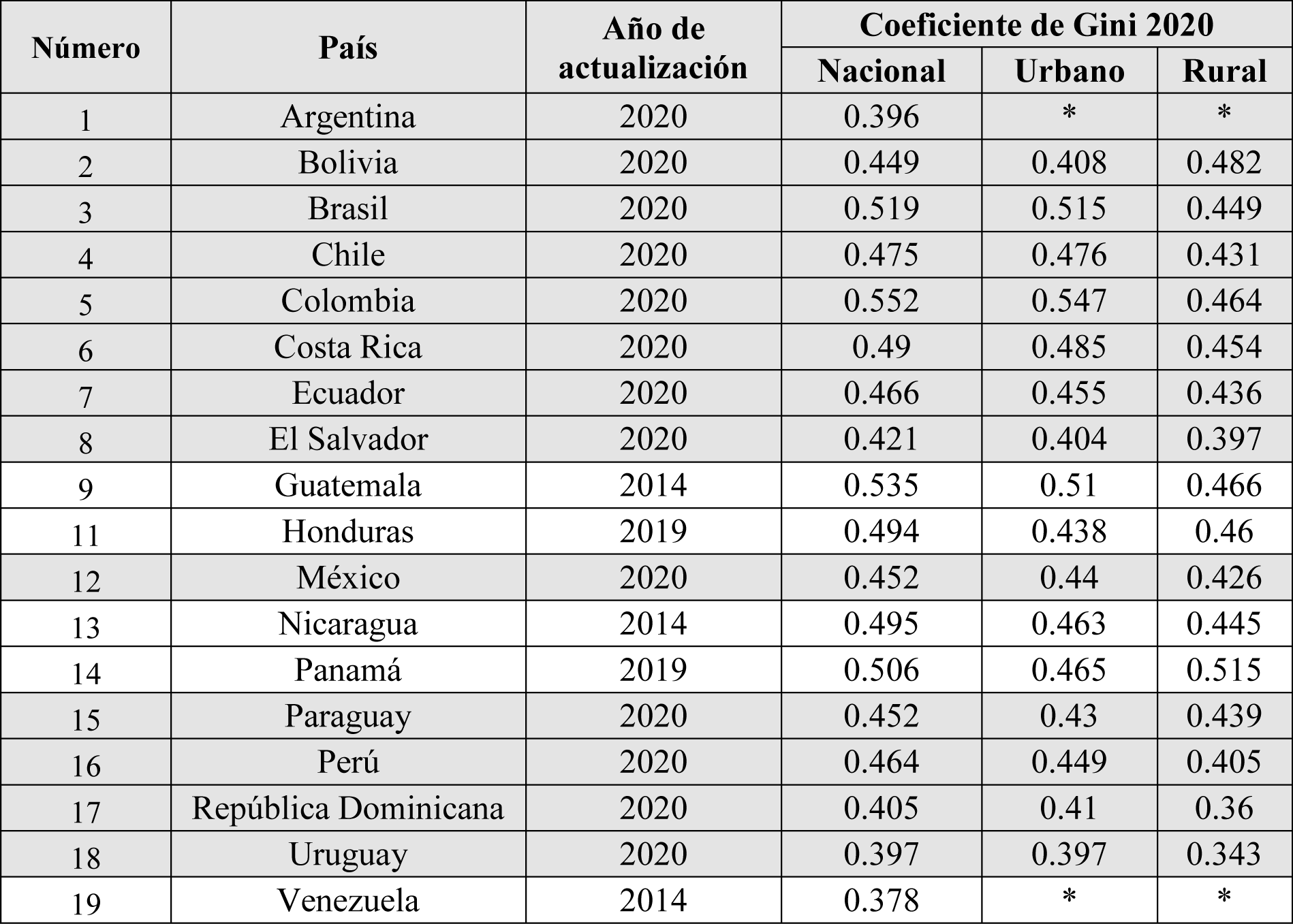 Cabe resaltar que de los 21 países que integran América Latina, no se encontró información de Guyana Francesa y Haití. Por otro lado, Guatemala, Honduras, Nicaragua, Panamá y Venezuela tienen una desactualización de información ante la CEPAL; situación que impidió contemplarlos en la obtención regional del índice de concentración de Gini.