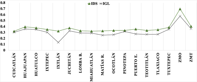 Ahora bien, en la gráfica 3 se muestra la relación existente entre el Índice de Desarrollo Sustentable (IDS) y el Índice de Gobernanza Local (IGL) que, en promedio, presenta un nivel medio. En ciudades como Tlaxiaco, Teotitlán, Puerto Escondido, Ocotlán, Ixtepec, Matías Romero, Juchitán y la ZMO existe una intensidad media en esta relación. En el caso de Ixtlán la relación es muy alta dado que, a pesar del nivel tan bajo del IGL, su IDS se encuentra posicionado en niveles similares al resto de las ciudades de estudio. En cuanto a Cuicatlán, Huajuapan, Huatulco, Loma Bonita, Miahuatlán, Pinotepa, Tuxtepec y la ZMT la intensidad es baja.