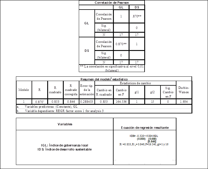 En el análisis de regresión entre el índice de gobernanza local (IGL) y el índice de desarrollo sustentable (IDS), y de acuerdo con el valor de R cuadrado corregido de 0.846, se puede concluir que el modelo explica en un 84.6% la relación entre ambas variables. No obstante, el modelo muestra un signo negativo (-0.329) que puede interpretarse como la existencia de elementos ajenos a los analizados que detienen el crecimiento del desarrollo sustentable. Ello genera la necesidad de realizar un estudio posterior para tomar en cuenta más variables que intervengan en la dinámica de la gobernanza local como el nivel de educación de la estructura de los gobiernos locales.
