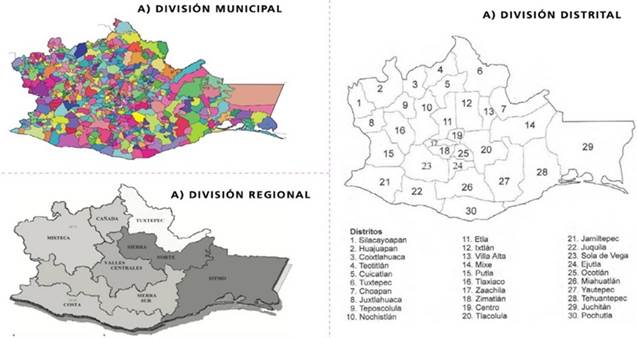 Su diversidad ambiental, territorial y social lo sitúa como un estado megadiverso. Es la entidad federativa con mayor riqueza biológica y multicultural de México (Avendaño et al., 2021). Esta característica se constituye por la presencia y convivencia de distintas formas de expresión cultural con variedad étnica y con variantes de vestimentas, costumbres, tradiciones e ideologías de sistemas de gobierno y de organización (Olivera et al., 2021b). Su división política es una de las más complicadas de México; está conformada por 570 municipios, 30 distritos y 8 regiones (mapa 2), lo que genera heterogeneidad política y multiculturalidad gubernamental en sus localidades (Olivera et al., 2022a).