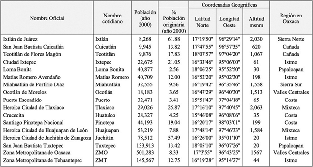 El artículo tiene un enfoque cuantitativo del tipo correlacional explicativo y es retrospectivo. Para ello se seleccionaron 17 ciudades del estado de Oaxaca bajo los criterios de elegibilidad y exclusión (Pérez et al., 2019). Las de elegibilidad fueron ciudades mayores o cercanas a los 15,000 habitantes que fueran lugar central de una región socioeconómica basada en una regionalización administrativa-nodal-homogénea; y las de exclusión, ciudades con menos de 15,000 habitantes carentes de información relacionada con la investigación. La ubicación de las ciudades se puede observar en el mapa 1; y su nomenclatura y algunas de sus características geográficas y demográficas, en la tabla 1.
