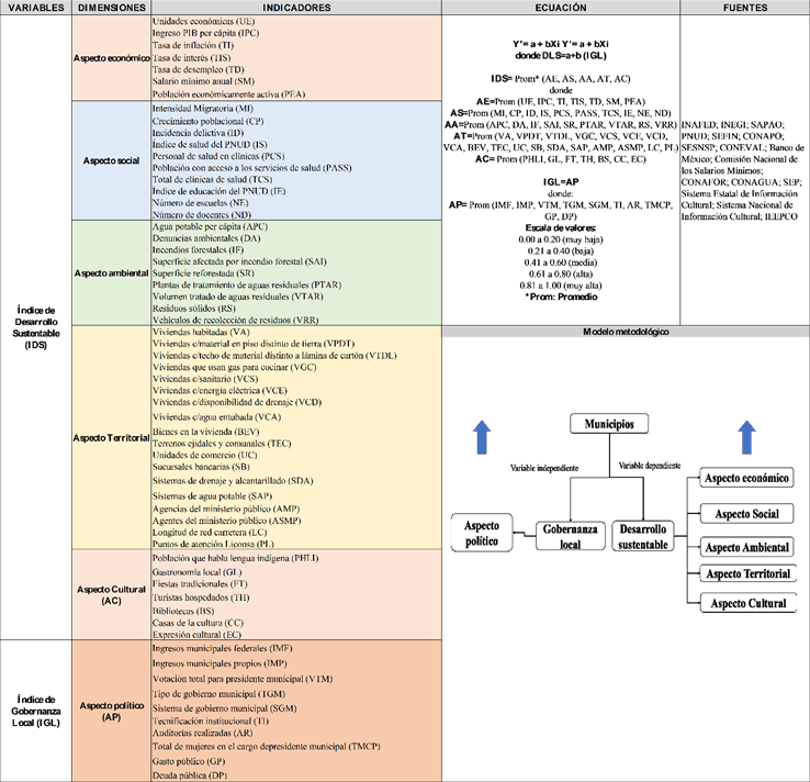 Metodológicamente, el modelo propuesto considera dos variables: la gobernanza local (variable independiente) y el desarrollo sustentable (variable dependiente). Para su análisis se utiliza el método de Sepúlveda (2008) para el diseño del índice de gobernanza local (IGL) y del índice de desarrollo sustentable (IDS). Aunque su modelo considera el aspecto ambiental, social, económico y político institucional, la presente investigación agrega el aspecto cultural y territorial.