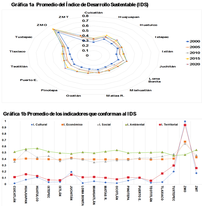 Por su parte, la gráfica 1b muestra cada ciudad estudiada y la dinámica de los indicadores que conforman al IDS. Se observa que, en promedio, los indicadores económico, social y ambiental registran resultados con niveles medio y alto. En contraste, los indicadores territoriales y, sorprendentemente, los culturales, tomando en cuenta el alto potencial cultural de Oaxaca, registran niveles muy bajos. Esto último se explica tomando en cuenta que en la ZMO se concentra gran porcentaje de la infraestructura y diversificación cultural, y, en menor medida, en Tuxtepec, en la ZMT y en Juchitán, lo que se puede visualizar de manera clara en la gráfica 1.