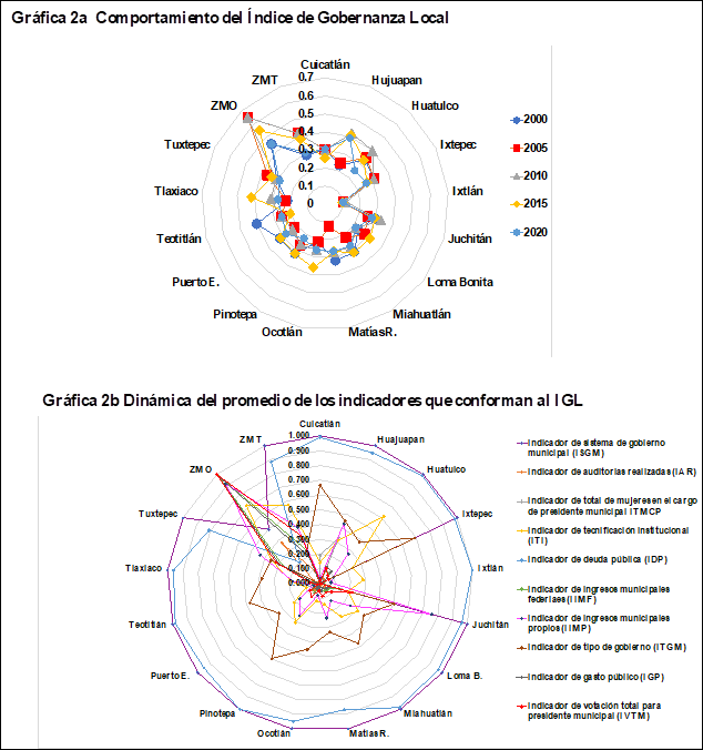 La gráfica 2a muestra al índice de gobernanza local (IGL) con niveles distintos para cada ciudad y para cada año con niveles de muy bajo a medio. En cuanto a la ZMO, su IGL es, en promedio, el mejor; además, no cuenta con oscilaciones drásticas, lo que significa que es constante. Sus mejores resultados se registran en el 2005 y 2010. El nivel del 2015 es mejor que el de 2020, año con resultados similares al 2000. Aunado a ello, es en el 2005, 2010 y 2015 cuando la ZMT tiene un nivel de IGL superior, aunque con nivel medio. En contraste, Cuicatlán e Ixtlán, a pesar de tener nulas variaciones, sus resultados son de nivel bajo a muy bajo.