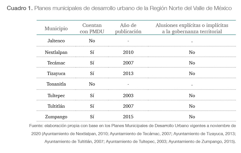 De manera complementaria, se revisó el estado de cosas que guardan el Plan Estatal de Desarrollo Urbano (Estado de México) y los planes de desarrollo urbano de los ocho municipios que conforman la znvm (Jaltenco, Nextlalpan, Tecámac, Tizayuca, Tonanitla, Tultepec, Tultitlán y Zumpango). Fundamentalmente, el análisis se focalizó en identificar los aspectos en materia de gobernanza territorial dentro dichos planes, y en establecer las áreas de oportunidad que la coyuntura actual les depara en el tema indicado.