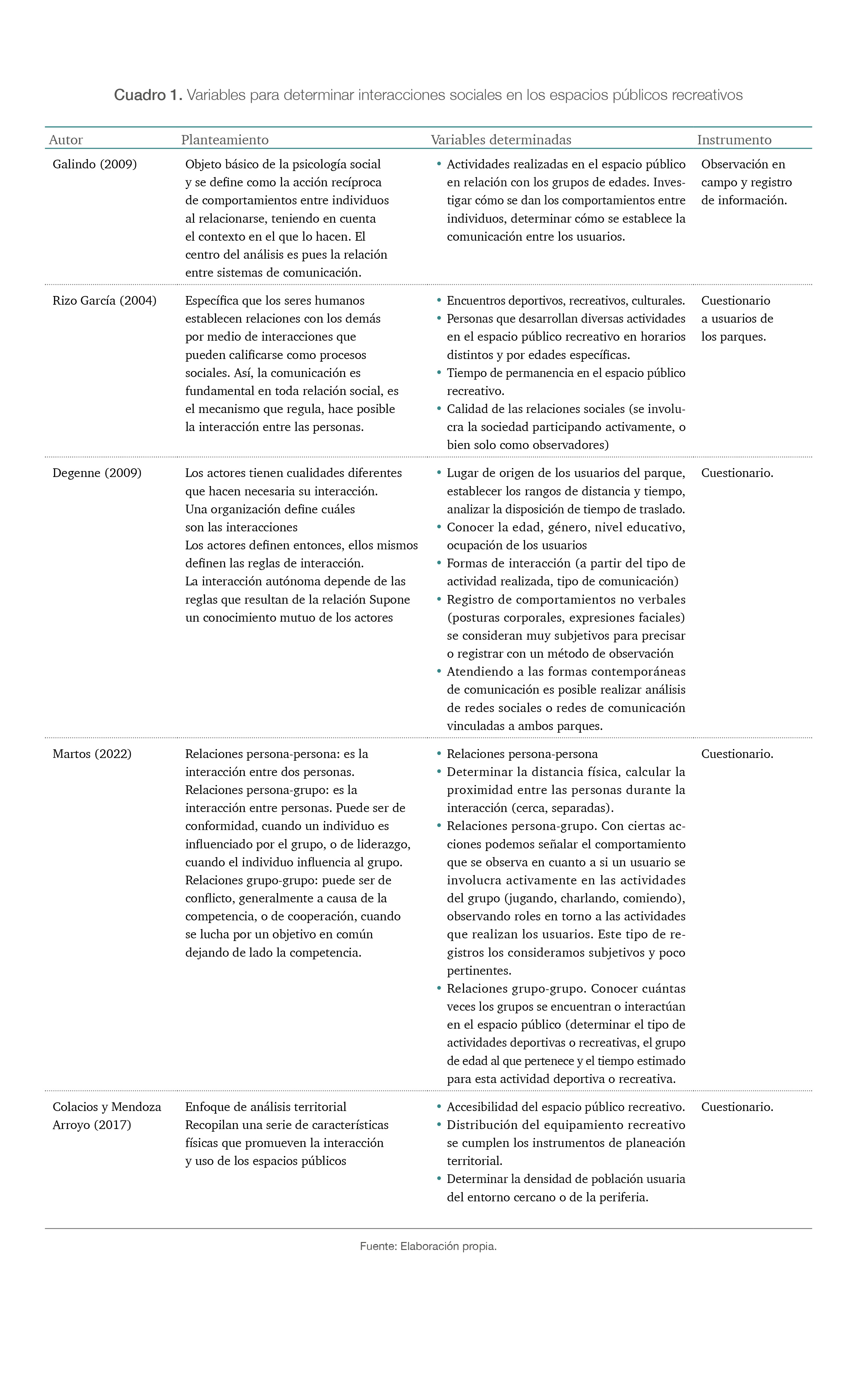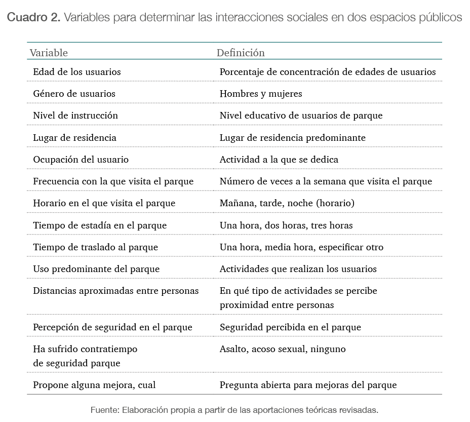 A partir de las aportaciones de los autores en torno a las interacciones sociales, determinamos integrar las variables que consideramos factibles para un diagnóstico que permita reconocer el tipo de interrelaciones sociales en los dos espacios públicos recreativos señalados (ver cuadro 1).