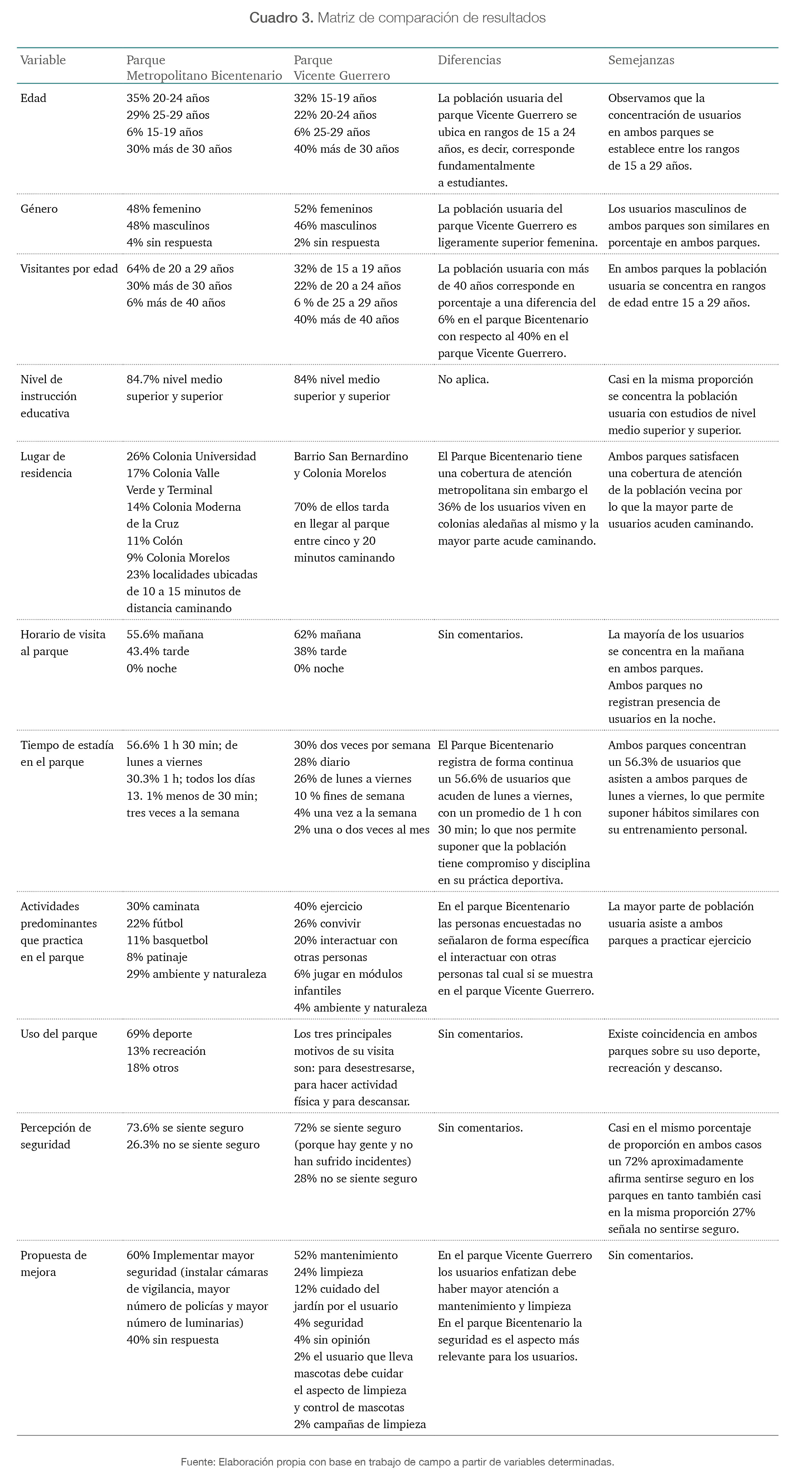 Con base en el cuestionario aplicado y la cédula de observación, se integró la matriz de comparación con las variables seleccionadas que se muestran en el cuadro 3.
