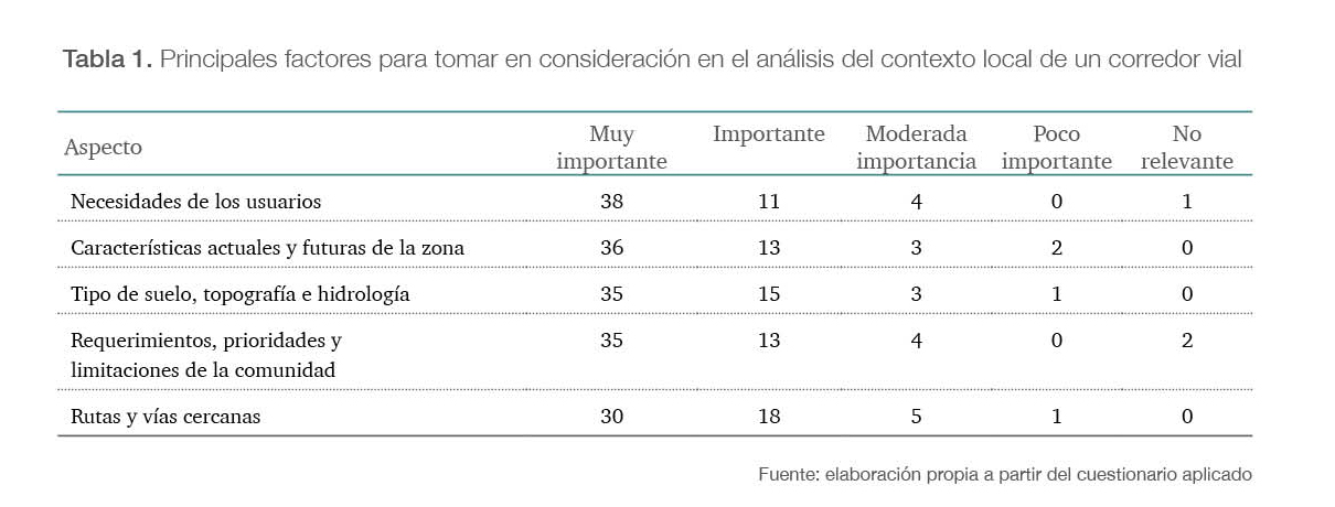 De acuerdo con las respuestas del cuestionario, los factores más relevantes al analizar el contexto local de un corredor vial son las necesidades de los usuarios; las características actuales y futuras de la zona: el tipo de suelo, topografía e hidrología; los requerimientos, limitaciones y prioridades de la comunidad; y rutas y vías cercanas. Se concluyó que las mejores propuestas, en cuanto a seguridad vial, son crear infraestructura independiente o separada para usuarios vulnerables (aceras y ciclovías), seguido del control y gestión de la velocidad, así como la pacificación vial.