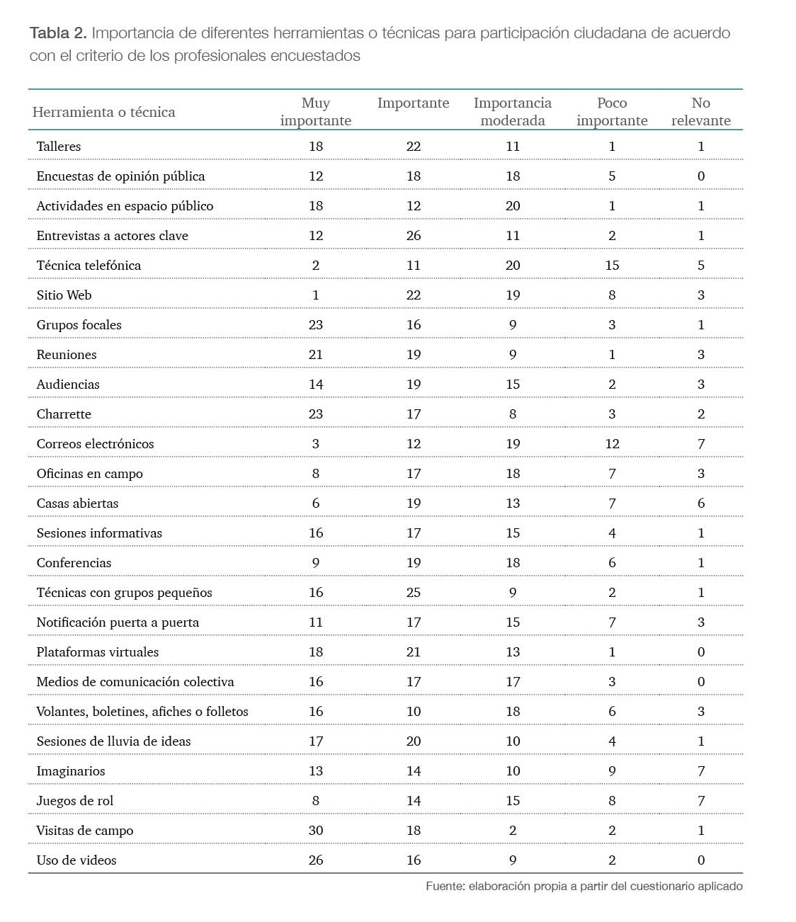 De acuerdo con los resultados obtenidos, las técnicas de participación de mayor importancia son visitas de campo, el uso de videos para brindar información, charrettes y grupos de enfoque.