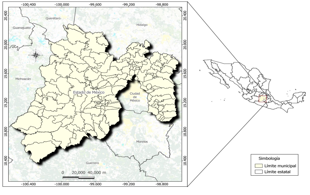 El Edomex se encuentra en la zona central de México (figura 1), en las coordenadas geográficas: norte 20° 17’ 00”; sur 18° 21’ 15” de latitud norte; este 98° 35’ 30”; oeste 100° 37’ 00” de longitud oeste (INEGI, 2024). Colinda al norte con Querétaro e Hidalgo; al oriente, Puebla y Tlaxcala; al sur, con Guerrero y Morelos; al poniente, Michoacán y Guerrero; además, envuelve a la Ciudad de México. Tiene una extensión territorial de 22 351 km2 (Instituto Nacional de Ecología y Cambio Climático [INNEC], 2020); lo que representa el 1.14 % de superficie respecto al total nacional (INEGI, 2015b). Lo integran 125 municipios que estructuran de forma diversa la entidad.