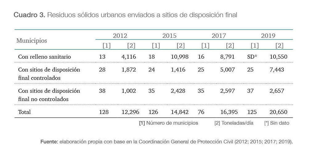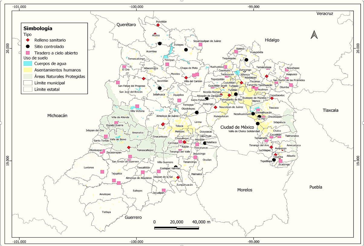 Por otra parte, como señalan los Programas de Protección Civil para Basureros (Coordinación General de Protección Civil, 2012; 2015; 2017; 2019), los rsu provenientes de diversos municipios son vertidos en los sdf (figura 3) ya sean rellenos sanitarios, sitios controlados o no controlados en toda la entidad mexiquense.