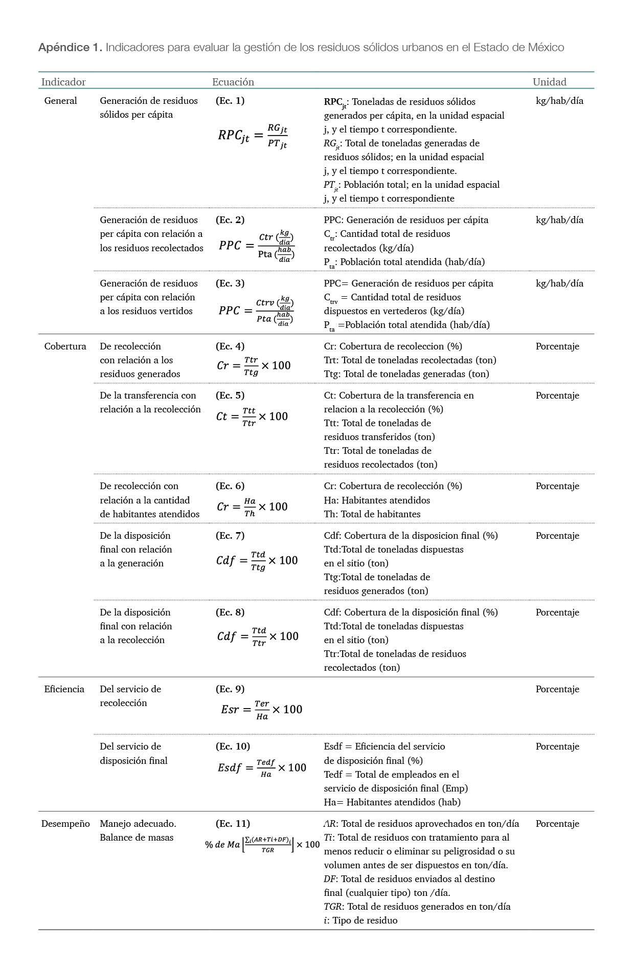 Una vez identificadas las etapas de atención prioritaria de la gestión de los rsu durante el diagnóstico, se definieron, para cada una de ellas, los indicadores que permitieran evaluar las características de estas fases. La descripción detallada de cada ecuación empleada en el cálculo de los indicadores se presenta en el apéndice 1.
