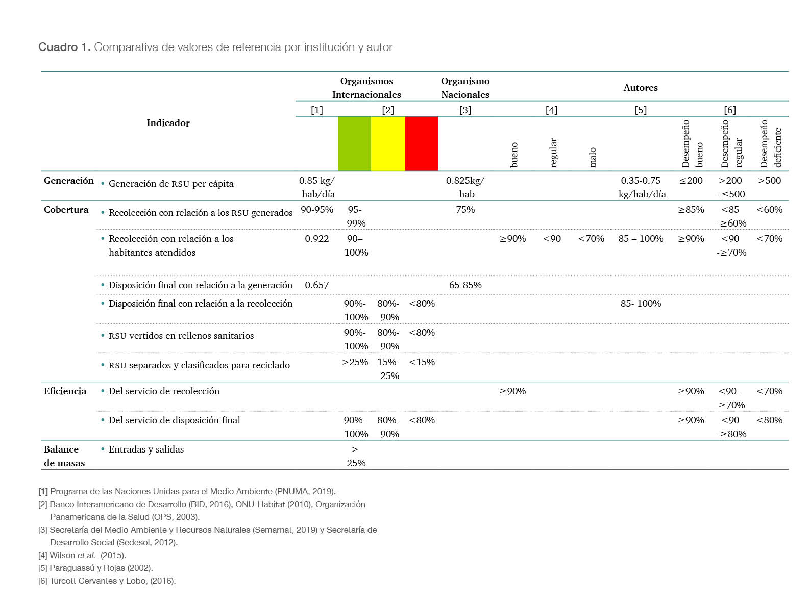 Se diseñó un marco de referencia basado en criterios establecidos por organismos internacionales y nacionales, así como en autores expertos en la materia (cuadro 1), que permiten medir o comparar los datos obtenidos del diagnóstico. Incluye indicadores como la generación, cobertura, eficiencia y balance de masas. Estos valores facilitan la evaluación práctica del manejo de los rsu; a la vez, coadyuvan a tomar decisiones estratégicas y priorizar acciones para mejorar la gestión de residuos.