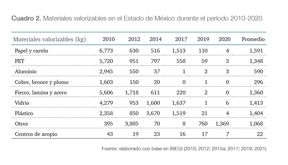 Existen siete centros de acopio distribuidos en cuatro municipios; en ninguno de ellos se registra retribución a cambio de materiales (INEGI, 2021). En estos sitios se reciben aproximadamente 1 517 kg/día en promedio, de los cuales 6 kg son de vidrio; 4 kg, otros plásticos; 4 kg son papel y cartón; 3 kg, pet; 1 kg, pilas y baterías; 2 kg de eléctricos y electrónicos; 3 kg de aluminio. Se registra que 1 369 kg corresponden a otros[4] y 125 kg de llantas (INEGI, 2021), no hay inventario de materiales como fierro, lámina, acero, cobre, bronce y plomo. En el cuadro 2 se muestra una comparación de la cantidad de materiales valorizables captados en los centros de acopio en el periodo de 2010 a 2020. Se observa una disminución considerable con el paso del tiempo, esto es a causa de la separación inadecuada desde el origen, falta de registros en los centros de acopio, así como de incentivos en la población para llevar sus residuos valorizables a un sitio de acopio, entre otros.