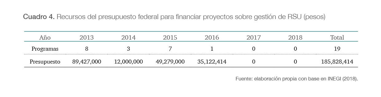 Se encontraron registros de los recursos financieros, provenientes del presupuesto federal destinados al manejo de los rsu en el Edomex, a partir del año 2013 hasta el 2018, a través de Programas de Prevención y Manejo Integral de Residuos y el Programa de Fortalecimiento Ambiental. De acuerdo con información obtenida del Diagnóstico básico para la gestión integral de los residuos (Semarnat, 2020) se entregaron subsidios para 19 proyectos de la entidad mexiquense. Durante el periodo 2013-2016, el presupuesto federal para el manejo de los rsu fue de 185 828 414.00 pesos (cuadro 4), en cambio, no se proporcionaron recursos económicos en los dos últimos años registrados.