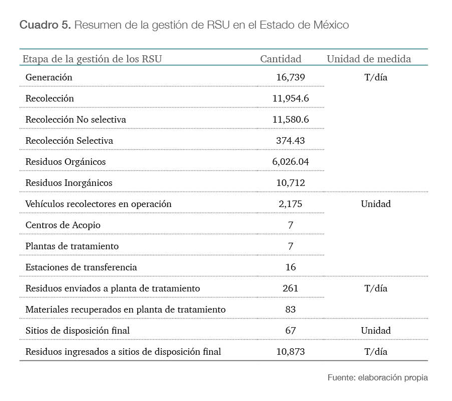 Finalmente, en el cuadro 5 se desarrollan las cifras clave obtenidas durante el diagnóstico de la gestión de los rsu. Estos datos son esenciales porque proporcionan información cuantitativa para evaluar los diferentes aspectos del sistema de gestión a través de los indicadores antes señalados (ver apéndice 1).