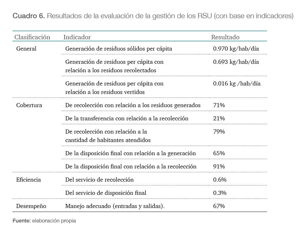 Como resultado del cálculo de las ecuaciones, se encontró lo siguiente: (i) de los indicadores generales se obtuvo que la generación de rsu per cápita es de 0.97 kg/hab/día. La recolección con relación a los residuos generados es del 71 %. La transferencia con referencia a la recolección es del 21 %. (ii) Acerca de los indicadores de cobertura, la recolección con relación a la cantidad de habitantes es del 79 %, la disposición final con relación a la generación es del 65 %; la disposición final con relación a la recolección es del 91 %. (iii) Los indicadores de eficiencia señalan que el servicio de recolección es de 0.6 %, mientras que la disposición final es del 0.3 %. Finalmente, los indicadores de desempeño muestran que el manejo adecuado de los rsu fue del 67 % (cuadro 6).