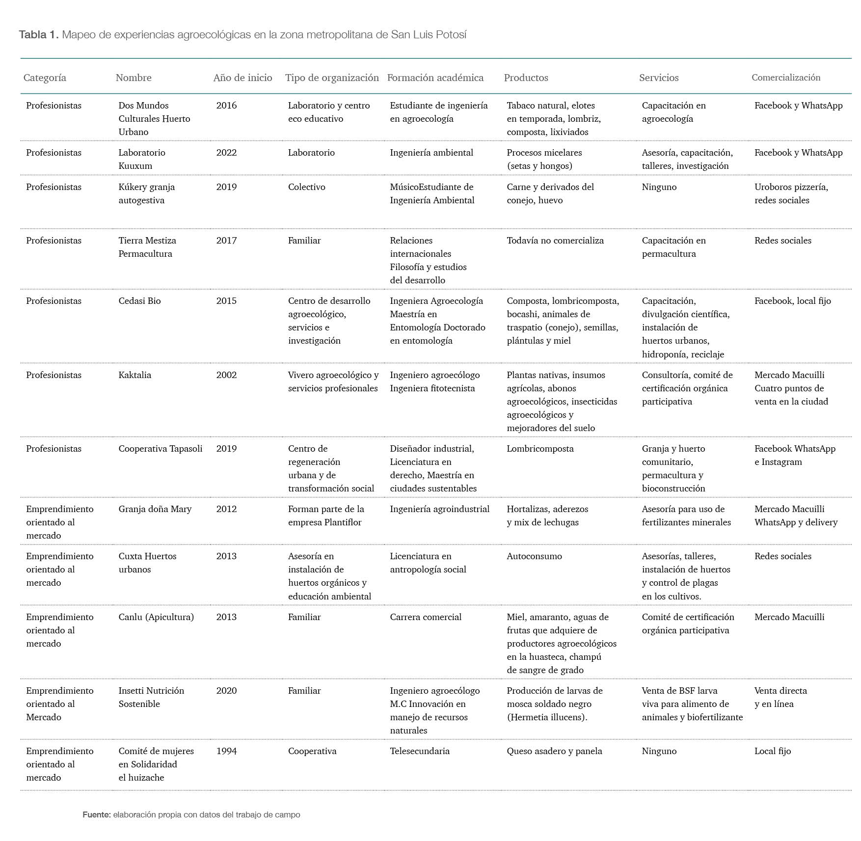 Según el trabajo de campo, las experiencias agroecológicas se dividieron en dos categorías: profesionistas en agroecología y emprendimiento orientado al mercado.