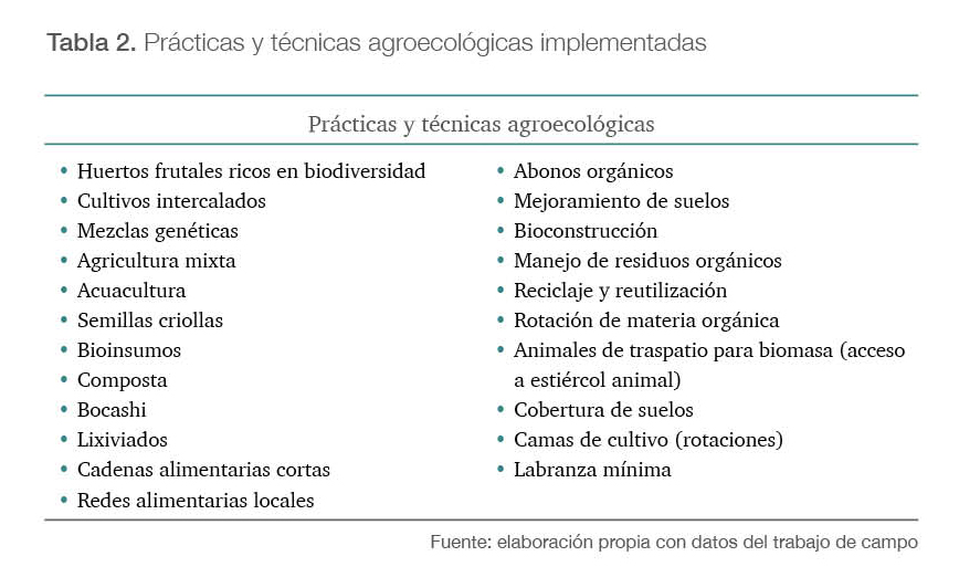 El apego a la ciencia se constata dentro de los huertos, en donde los entrevistados trabajan con bitácoras de registro, pruebas de laboratorio, mediciones y contrastaciones. En el caso del Laboratorio Kuuxum, enfocado al cultivo de hongos, cuenta con infraestructura básica de laboratorio para producir micelio, además, utilizan un lenguaje científico para explicar qué es y cómo funciona la agroecología. La tabla 2 enlista las técnicas agroecológicas utilizadas por los entrevistados en sus huertos.