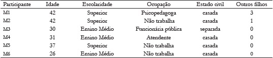 Participaram da pesquisa, seis mães de crianças com autismo. As mulheres entrevistadas deviam satisfazer os seguintes critérios de inclusão: ser mãe de criança com diagnóstico de autismo e ter vontade e possibilidade de colaborar com o estudo. As participantes tinham idade média de 35 anos (DP = 5,92), todas elas pertencentes à classe socioeconômica média, três delas com nível de estudo superior e três delas com nível médio. A idade média das crianças com autismo, filhos das participantes era de cinco anos (DP = 2,96), conforme dados apresentados a seguir na Tabela 1.