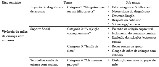 Os dados analisados, conforme apresentados na Tabela 2, partiram do estudo de um eixo temático que, a partir da análise do discurso das entrevistas semiestruturadas com as mães de crianças com autismo, foram encontradas regularidades discursivas que delinearam três temas. Desses temas, foram configuradas quatro categorias conforme apresentado na Tabela 2.
