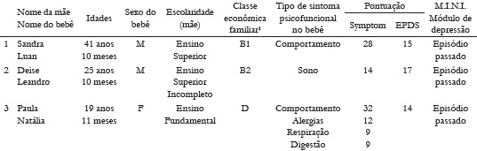 Quanto às características gerais das participantes, idade, classe econômica e escolaridade variaram. Ademais, todas são solteiras, apenas Sandra possui uma união estável com o pai do bebê, apesar de não morarem juntos. Também, verifica-se que a pontuação no EPDS foi similar (14 a 17 pontos), com a identificação de sintomas de depressão, porém o MINI, que revelou que todas apresentaram episódio depressivo passado, não confirmou o diagnóstico. Esse dado aponta, por um lado, que a ocorrência de depressão em outro contexto de vida favorece a manifestação da depressão materna (Aliane, Mamede, & Furtado, 2011), e por outro, incita um questionamento imprescindível sobre o diagnóstico. O MINI é fundamentado nos critérios do DSM, entretanto, ele não foi sensível à detecção de sintomas atuais de depressão como foi o EPDS, que é exclusivo para a depressão materna.