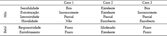 A análise do IAP dos três casos sinalizou que as mães mostraram uma sensibilidade boa (exceto Deise, que foi excelente), estruturação inconsistente (exceto Deise, que foi excelente), postura parcialmente intrusiva e com hostilidade encoberta (exceto Sandra, que não foi hostil). Esse resultado corrobora o que afirmam Fonseca, Silva e Otta (2010), que a estruturação proporcionada pela mãe tem correlação positiva com o apoio social percebido por ela, e duas mães, em algum momento, revelaram essa carência, com exceção de Sandra, que não deixou claro o apoio familiar que recebia. Além disso, todas foram parcialmente intrusivas, corroborando os trabalhos de Schwengber e Piccinini (2004) e Alvarenga e Palma (2013), que sinalizam que mães com depressão apresentam maior intrusividade na interação mãe-bebê.