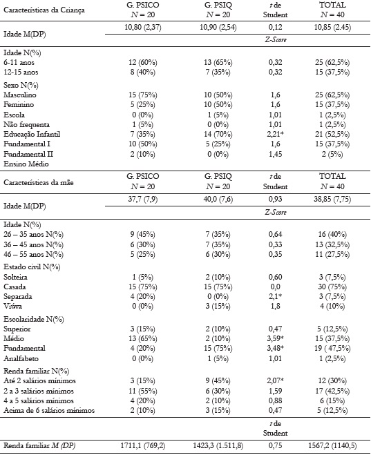 Em termos de idade e sexo, não foram observadas diferenças significativas entre os grupos de crianças, sendo que, em ambos os grupos, a maioria dos participantes tinha idade compreendida entre seis e 11 anos. Para a idade materna, que variou entre 26 e 55 anos, também não se identificou diferenças estatisticamente significativas. A maior parte das crianças em ambos os grupos frequentava a escola. Ao comparar os grupos, observa-se que o dobro das crianças do GPSIQ cursava o Ensino Fundamental I, que compreende o antigo primário, e o dobro das crianças do GPSICO cursavam o Ensino Fundamental II, antigo ginásio. Na Tabela 1, pode-se verificar as principais características sociodemográficas dos 40 participantes.