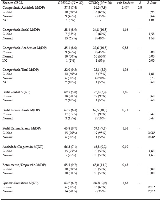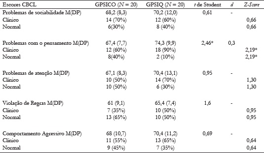 A análise dos escores do CBCL indicou diferenças significativas entre os grupos apenas em duas escalas: escalas de Competência em atividades e Problemas de Pensamento. O escore em Competência em atividades foi maior no GPSICO, com um valor de magnitude de efeito elevado (d = 0,8), o que indica que a diferença entre os escores médios são bastante substanciais. Foi verificada diferença estatisticamente significativa em Problemas de Pensamento entre os grupos, de modo que o GPSIQ apresentou escores mais elevados nessa escala do que o GPSICO, embora, o valor d nessa comparação tenha sido de 0,3 (baixo). As análises das proporções das classificações “clínico” e “normal” demonstraram que o GPSIQ apresentou significativamente maior número de participantes com classificações clínicas para problemas externalizantes, queixas somáticas e problemas de pensamento. De modo geral, as estatísticas, tanto a partir das médias das pontuações quanto das proporções, indicaram que o GPSIQ apresentou escores piores no que se refere a problemas de comportamento e competência social.