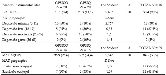 Observa-se que as mães do GPSIQ apresentam escores mais elevados de depressão e mais rebaixados no nível de satisfação conjugal. O valor de magnitude de efeito elevado (d = 0,8) indica que a diferença entre os escores médios são bastante substanciais. Em termos de classificação, 60% das mães do grupo GPSIQ apresentavam depressão moderada ou grave, enquanto a maior parte das mães do grupo GPSICO (50%) apresentou depressão classificada como mínima, havendo uma diferença substancial entre os grupos em relação a essa última classificação.