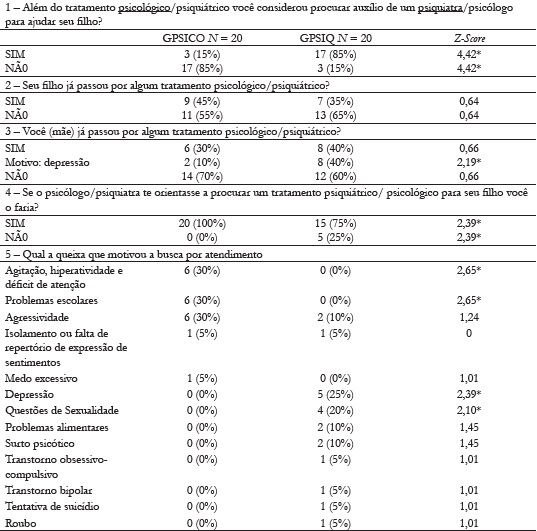 A análise das respostas revela que mães do GPSIQ consideraram optar também pela modalidade de Psicologia para complementar a intervenção (85%); das mães do GPSICO, apenas 15% consideraram procurar auxílio de psiquiatra para tratamento dos problemas de seus filhos. As mães do grupo GPSICO também afirmaram com maior frequência que seus filhos eram reincidentes na respectiva modalidade de tratamento (45%) em relação ao GPSIQ (35%), sendo que 40% das mães do GPSIQ foram atendidas pela mesma modalidade para resolver dificuldades próprias, enquanto no GPSICO, apenas 30% procuram um psicólogo para suas problemáticas. Cabe pontuar que, dentre as mães do GPSICO, apenas 10% procuraram terapia por estarem depressivas; enquanto, para as do GPSIQ, 40% o fizeram pelo mesmo motivo. No GPSICO, 100% das mães aceitariam encaminhamento da criança ou adolescente para um psiquiatra. Enquanto 75% das mães do GPSIQ aceitariam o encaminhamento para um psicólogo.