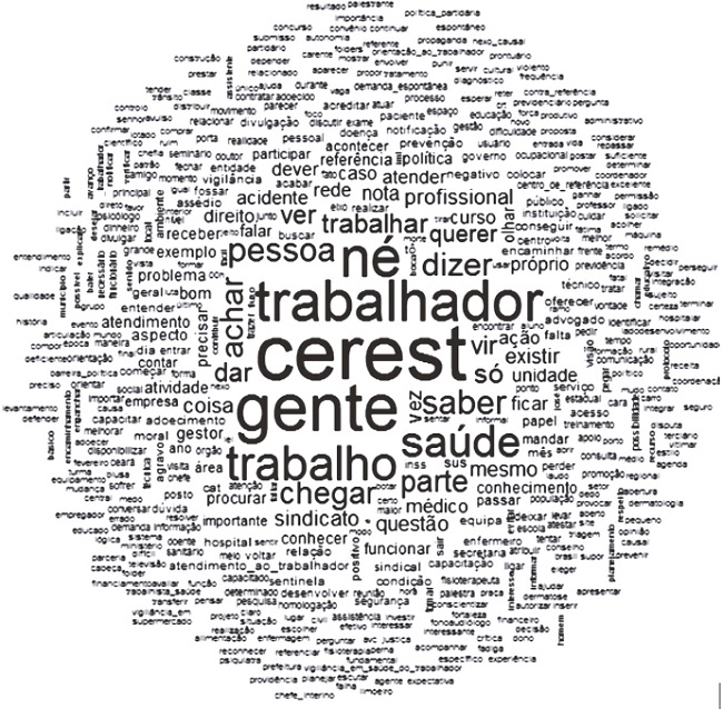 Observa-se que as palavras que mais apareceram nas falas dos participantes fazem referência aos principais tópicos abordados nas classes temáticas apresentadas no decorrer deste estudo. Destacam-se: CEREST, trabalhador, saúde, trabalho, sindicato, conhecimento, direito, política, atendimento, referência, vigilância. Reforça, portanto, que, para os representantes dos sindicatos e usuários do CEREST, é importante a figura do trabalhador, assim como as ações voltadas para sua saúde. Restou, evidenciada ainda, a importância dos sindicatos e do referenciamento para acesso do usuário.