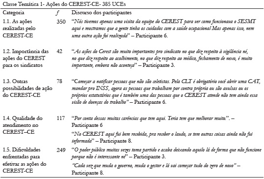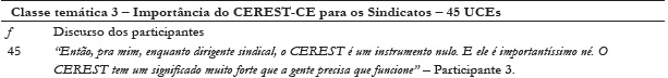 Essa classe temática, representada por 45 UCEs, retrata o discurso dos representantes de sindicatos sobre a importância do CEREST-CE para os sindicatos (ver Tabela 3). Para eles, o centro, enquanto proposta prescrita por lei é uma ferramenta de suma importância para a saúde do trabalhador em todos os aspectos (pesquisa, educação em saúde do trabalhador, capacitação). Ele assessora o movimento sindical nas demandas de saúde e de ambiente de trabalho. No entanto, alguns representantes o consideram um instrumento nulo, porque não funciona como deveria.