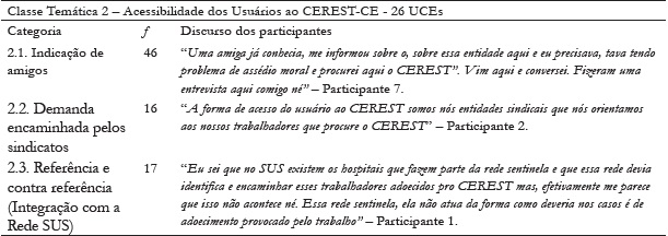 Essa classe temática representada por 79 UCEs, distribuídas em três categorias, se refere às crenças dos representantes de sindicatos e dos usuários sobre as formas de acesso ao CEREST-CE (ver Tabela 2). No acesso por meio de (2.1) “Indicação de amigos”, os usuários chegam ao Centro por sugestão de pessoas que já foram atendidas ou que trabalham no Centro. Quanto ao acesso por meio da (2.2) “Demanda encaminhada pelos sindicatos”, esta se refere aos trabalhadores que chegam aos sindicatos acometidos por alguma doença relacionada ao trabalho em busca de orientação relativa a questões jurídicas e previdenciárias e são encaminhados ao CEREST-CE para serem atendidos pela equipe de profissionais da unidade.